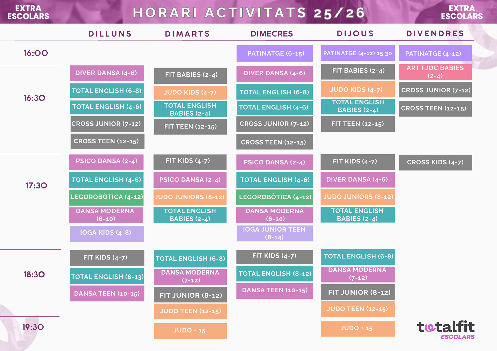 A Totalfit trobaràs activitats extraescolars per a infants i joves de 2 a 15 anys: aprenentatge, moviment i creativitat per a totes les edats.