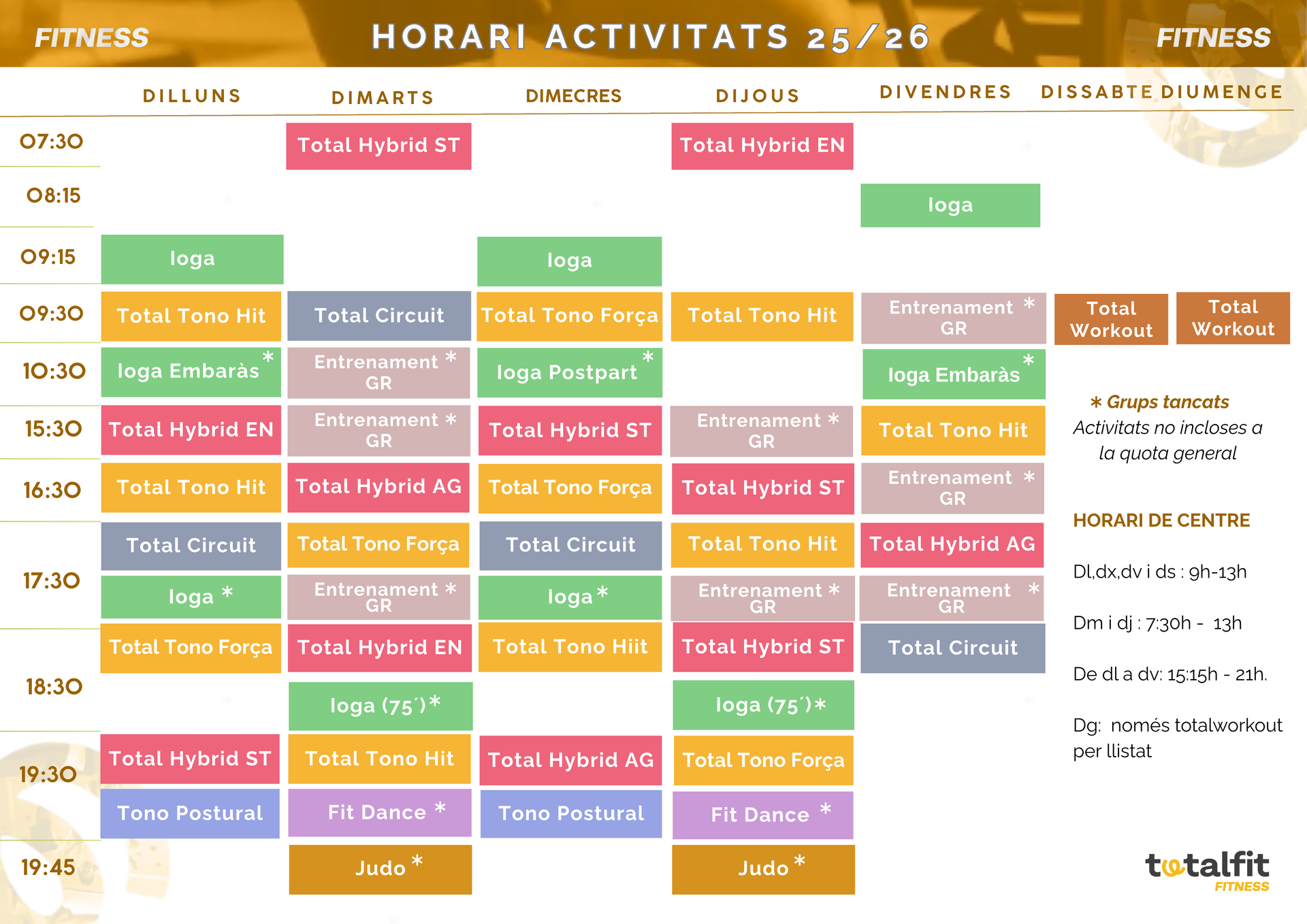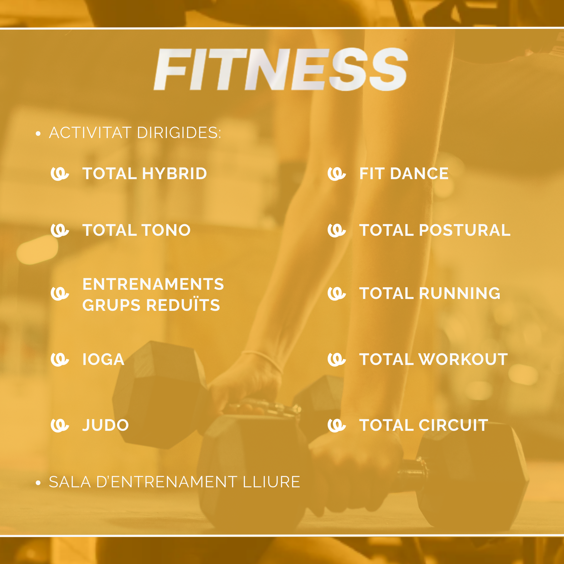 💪 Entrenament híbrid | 🔥 Sala de força | 🧘 Ioga | 🥋 Judo adults | 👟 Grups de running social | ✨ Tonificació